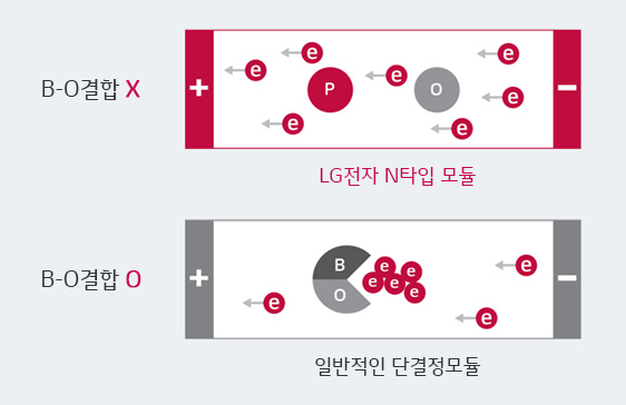 일반적인 단결정 모듈이, Boron과 산소 결합체 생성에 의한 초기 출력 저하 현상(LID: Light Induced Degradation)을 겪는데 반해, LG NeON™ 2는 N형 웨이퍼를 사용하기 때문에, LID로 인한 출력 저하 현상이 거의 없습니다.