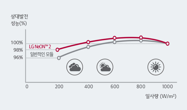 LG 초고효율(NeON™ 2) 모듈은 일사량이 200 W/m²로 낮을 때에도 상대적인 발전 성능 98%를 유지하는데, 이는 구름이 많은 날에 더 많은 전기를 생성할 수 있음을 의미합니다.